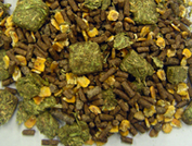 とうもろこし、小麦、ごま油粕、米ぬか、アルファなどを混ぜ合わせた配合飼料です。