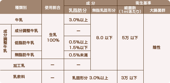 | 成分調整牛乳 | 生乳から、乳成分(脂肪・無脂乳固形分・水分等)の一部を取り除いたものです。 |